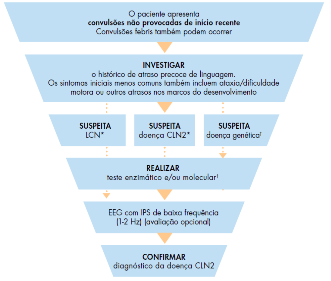 Referência: 1. Schulz A, Kohlschütter A, Mink J, Simonati A, Williams R. NCL diseases – clinical perspectives. Biochimica et Biophysica Acta. 2013;1832:1801-1806. 2. Pérez-Poyato MS, Marfa MP, Abizanda IF, et al. Late infantile neuronal ceroid lipofuscinosis: mutations in the CLN2 gene and clinical course in Spanish patients. J Child Neurol. 2013;28:470-478. 3. Worgall S, Sondhi D, Hackett NR, et al. Treatment of late infantile neuronal ceroid lipofuscinosis by CNS administration of a serotype 2 adeno-associated virus expressing CLN2 cDNA. Hum Gene Ther. 2008;19:463-474. 4. Nickel M, Jacoby D, Lezius S, et al. Natural history of CLN2 disease: quantitative assessment of disease characteristics and rate of progression. Poster session presented at: The 12th Annual WORLD Symposium; February – March 2016; San Diego, CA. 5. Fietz M, Giugliani R, AlSayed M, et al. Expert recommendations for the laboratory diagnosis of neuronal ceroid lipofuscinosis type 2 (CLN2 disease): diagnostic algorithm and best practice guidelines for a timely diagnosis. Poster session presented at: The 12th Annual WORLD Symposium; February – March 2016; San Diego, CA.